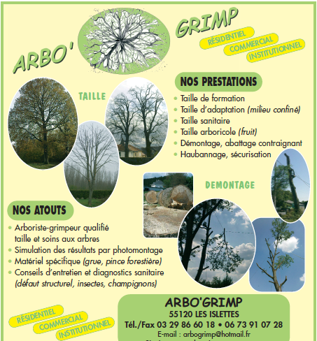 Arbo'Grimp à les Islettes , s'occupe de l'entretien, de l'élagage ou de l'abattage de vos arbres . L'arboriste grimpeur s'apparente au métier de paysagiste avec la particularité d'operer en hauteur sur des sujets de toutes tailles (arbre forestier, d'ornement,fruitier,haie) .
